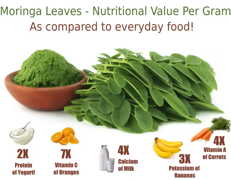 Daun kelor memiliki kandungan sekitar 22-29% protein pada berat kering, menjadikannya sumber protein nabati yang sangat baik.