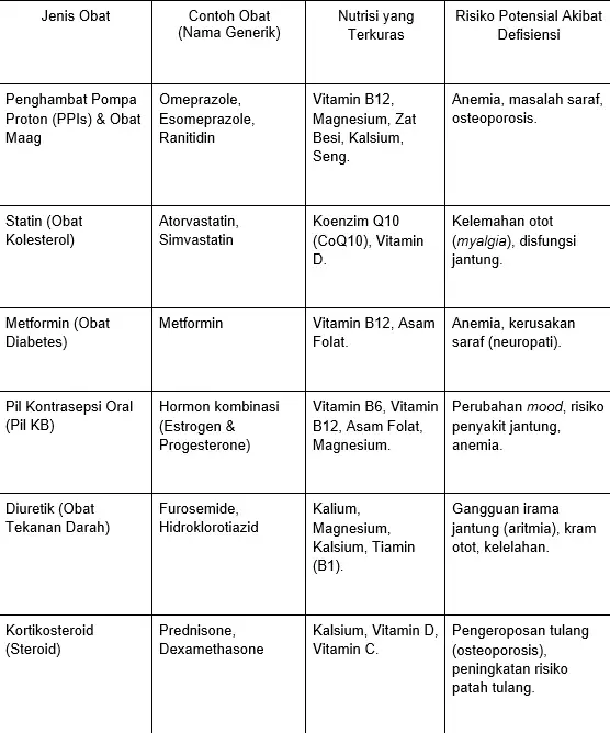 Tidak semua obat menyebabkan turunnya nutrisi tubuh, namun obat yang dikonsumsi rutin dalam jangka panjang memiliki risiko yang lebih tinggi. Berikut adalah beberapa kelas obat umum dan nutrisi yang paling terpengaruh: