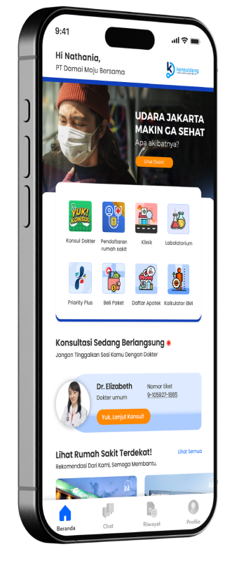 Akses dokter pribadi 24 jam untuk bertanya apa saja — dari keluhan ringan, saran obat, hingga rekomendasi tindakan medis.